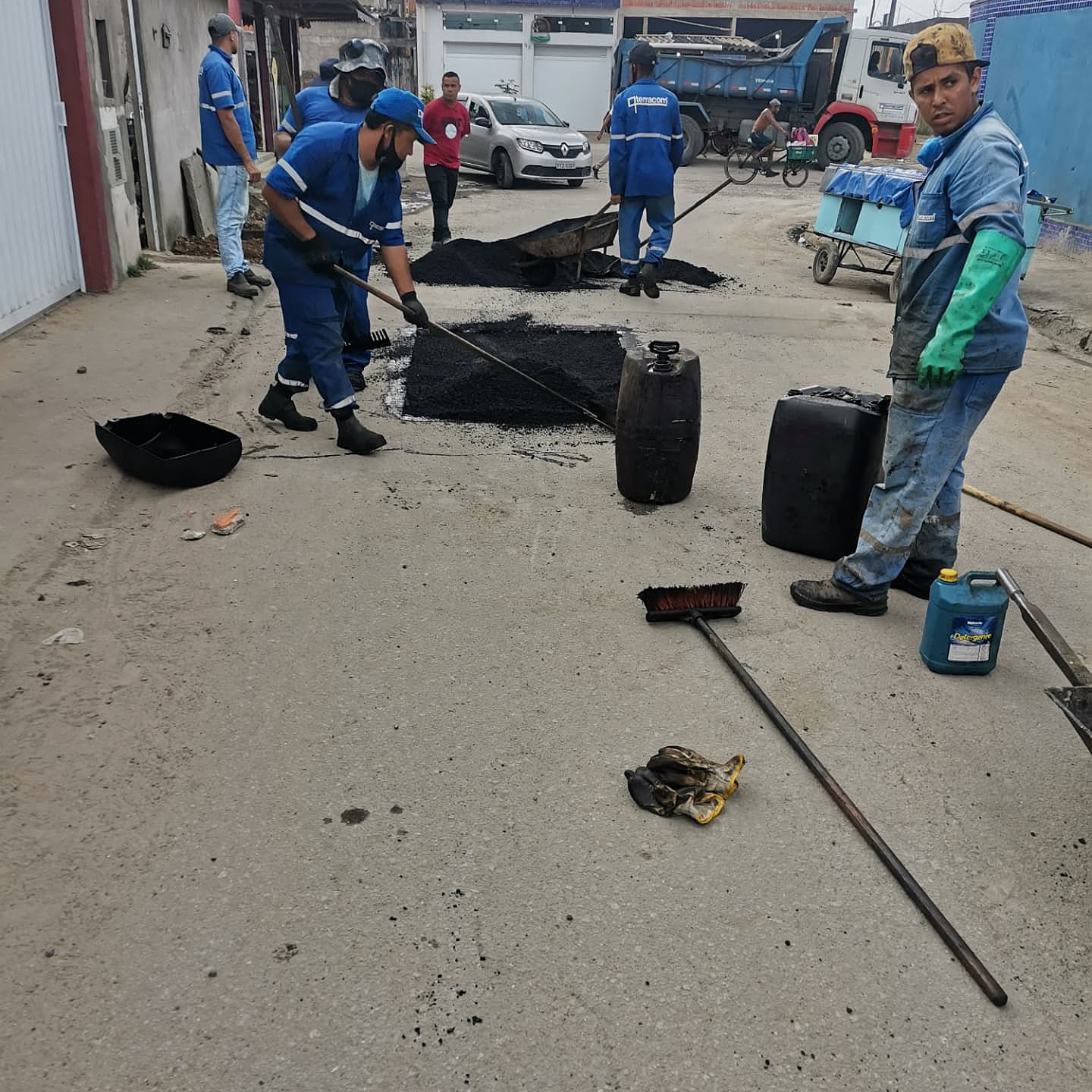 Depois de ter sido feito a substituição dos tubos que estavam quebrados, e também ter sugado toda a rede pluvial da rua Vinte, também foi realizado o serviço de tapa buracos na mesma e na Dezoito.